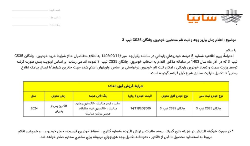 بر اساس اطلاعیهای که از سوی گروه خودروسازی سایپا منتشر شده، متقاضیانی که در اولویت خرید چانگان CS35 پلاس تیپ ۳ قرار دارند و وضعیت آنها در مرحله ارسال به خودروساز تأیید شده است، میتوانند با پرداخت مبلغ ۱ میلیارد و ۴۱۱ میلیون تومان این کراساوور را خریداری کنند. پیامک حاوی لینک پرداخت به این افراد ارسال خواهد شد و تحویل خودروها نیز حداکثر تا ۹۰ روز کاری انجام میشود.